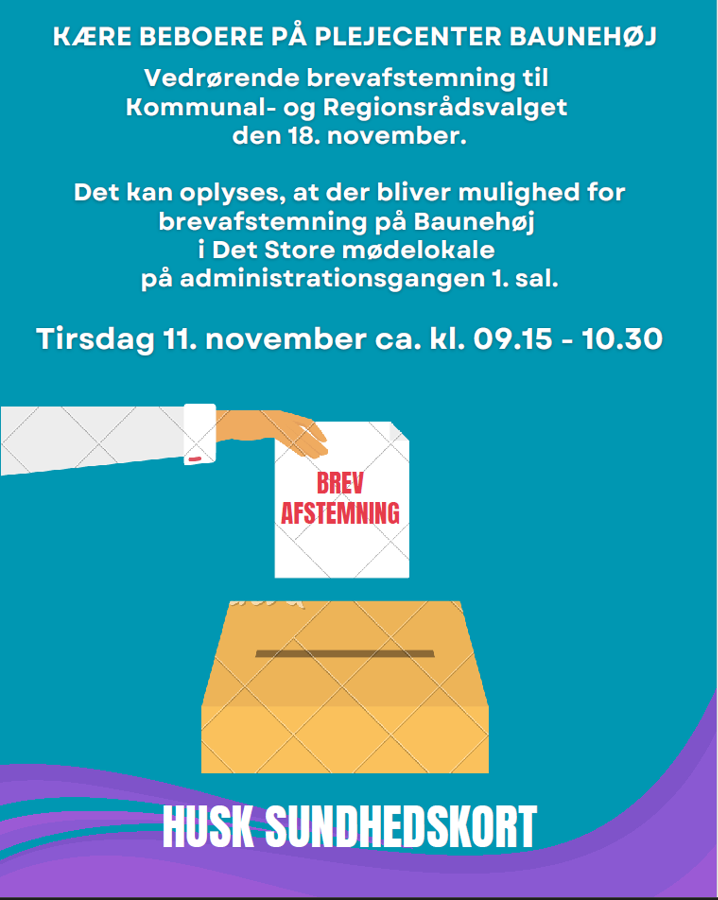 Det kan oplyses, at der bliver mulighed for brevafstemning på Baunehøj i Det store mødelokale på administrationsgangen 1. sal tirsdag den 11. november ca. kl. 09.15 - 10.30.