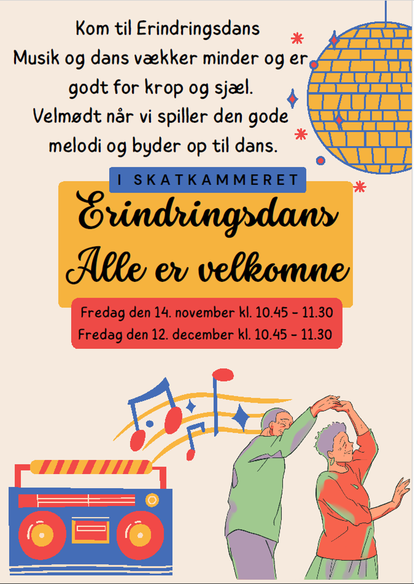 Kom til Erindringsdans fredag den 14. november kl. 10.45 - 11.30 og fredag den 12. december kl. 10.45 - 11.30 i Skatkammeret.