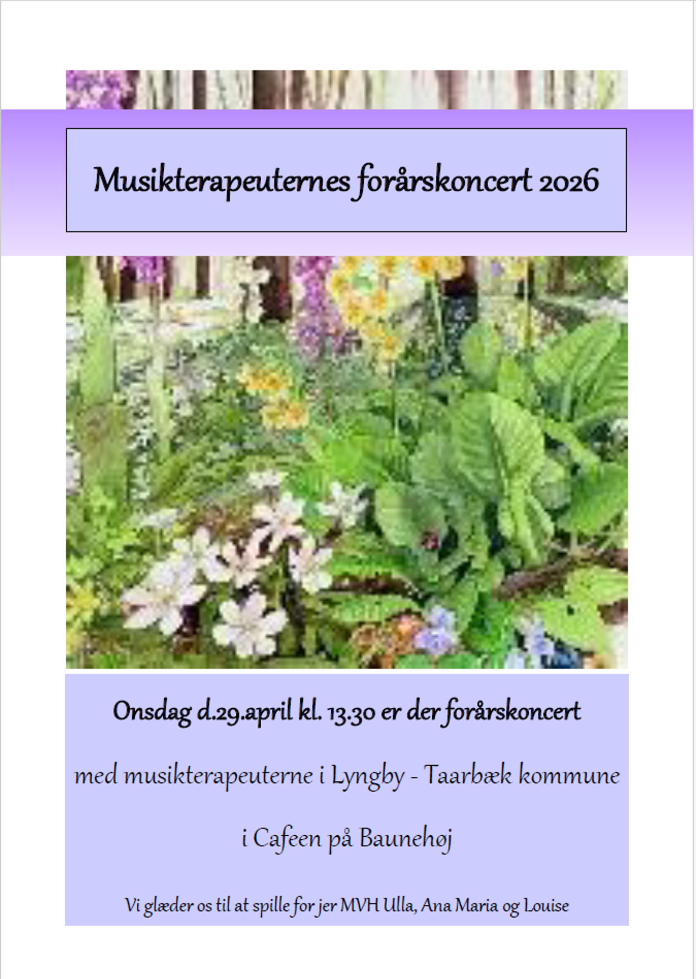 Musikterapeuternes forårskoncert 2026 bliver afholdt onsdag den 29. april kl. 13.30- 14.15 i cafeen.